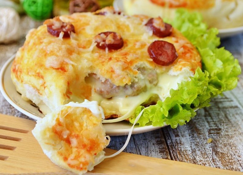 3. На тесто выложите колечко моцареллы, сверху — котлету.