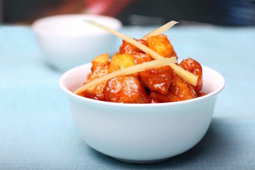 6. Возвращаемся к кисло-сладкому соусу. Разогреваем сковороду (вок) и выкладываем заготовку соуса. Даем ему пару минут покипеть, после чего в сковороду добавляем мясо и быстро размешиваем, чтобы соус полностью покрыл все кусочки (в воке очень удобно смешивать продукты, подбрасывая их).