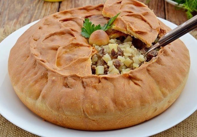 7. В центре сделать отверстие примерно 1,5–2 см в диаметре, закрыть его шариком-пробкой и поставить пирог в разогретую до 180 °C духовку на 2,5 часа. Через минут 40–50 открыть "пробку" и влить немного бульона (добавлять бульон или нет будет зависеть от крахмалистости картофеля). Убавить температуру до 150–160 ºC и допечь пирог.
